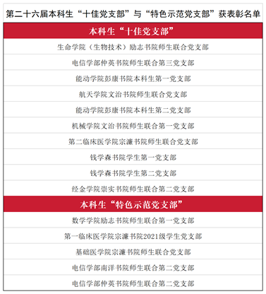 经评审,生命学院(生物技术)励志书院师生联合党支部等10个党支部荣获第二十六届本科生“十佳党支部”称号,数学学院励志书院师生联合第一党支部等5个党支部获得本科生“特色示范党支部”称号。