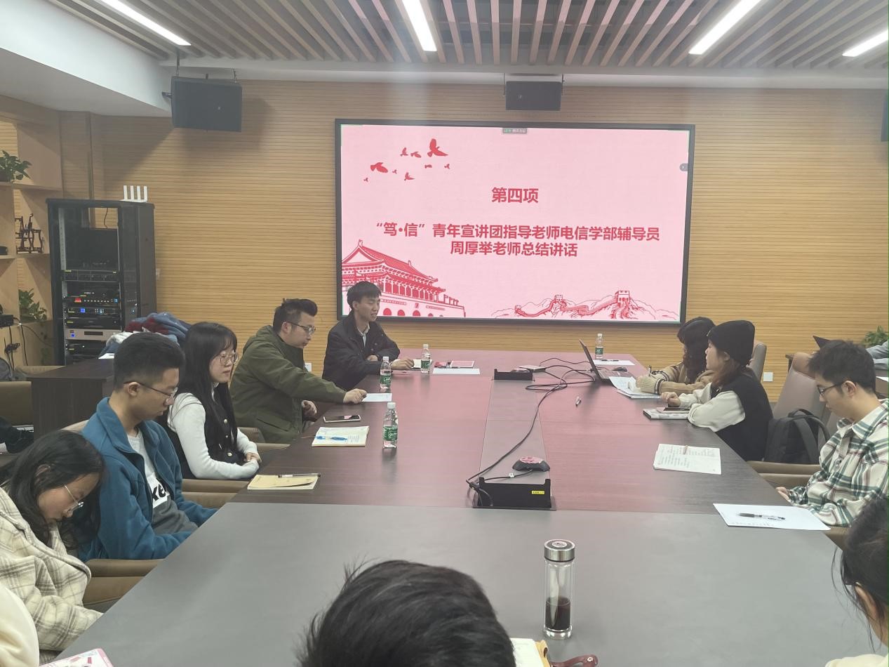 周厚举对宣讲团成员和党支部书记提出要求:一、提高政治站位,加强理论学习。二、热爱宣讲工作,传递思想价值。三、锤炼宣讲本领,加强思考总结。他鼓励所有党员同志积极参加电信学部第三届微党课比赛。