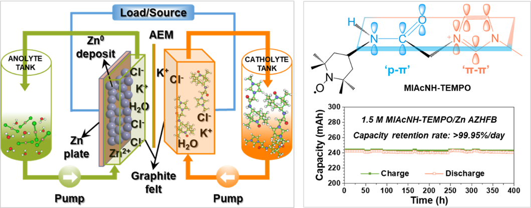 2,2,6,6-四甲基哌啶-N-氧基(TEMPO)类氧化还原活性分子以其环境友好、化学电位高、氧化还原可逆性好等优势,是迄今水系液流电池正极材料的理想选择之一。然而,水溶性TEMPO类分子易在充放电过程中发生不同程度的副反应如自催化氧化、歧化和开环反应等,使得分子结构发生降解或者失活。这些不利因素导致锌-TEMPO水系液流电池容量衰减速率快、服役日历寿命缩短,成为其规模化发展应用的主要瓶颈问题。
