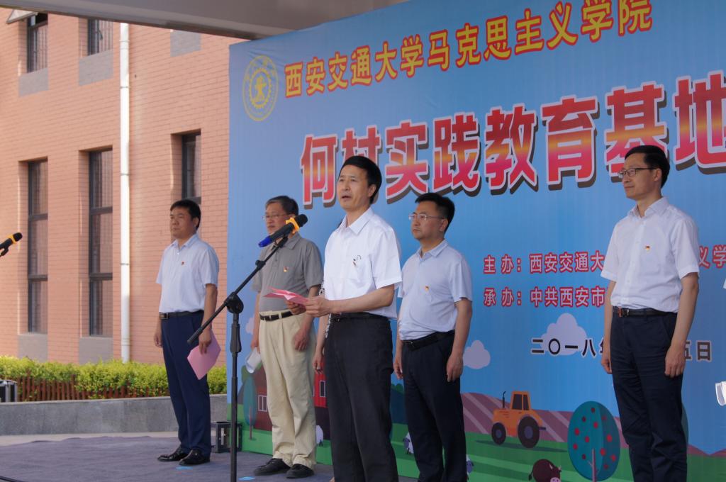 西安交大党委副书记、纪委书记赵军武对高陵区委、区政府的精心准备表示衷心感谢。他谈到,高陵区历史悠久、人杰地灵,新时代更是紧抓历史发展机遇期,在社会主义新农村建设中走在全省全国前列。当前,西安交大积极探索与实践新时代高校思想政治教育“三全育人”模式,通过结合地方实际与学校办学特色,进一步改进和加强高校思政教育工作,充分发挥高校人才智库优势、服务地方发展,实现高校与社会共赢。实践教育基地的建设,是以中共高陵历史纪念馆为教材、以社会主义新农村建设示范村何村为案例,全面加强党员干部理想信念教育,激发情感共鸣、增强思想认同,铭记革命历史、传承西迁精神,为推动学校建设发展注入思想引领的强心针。